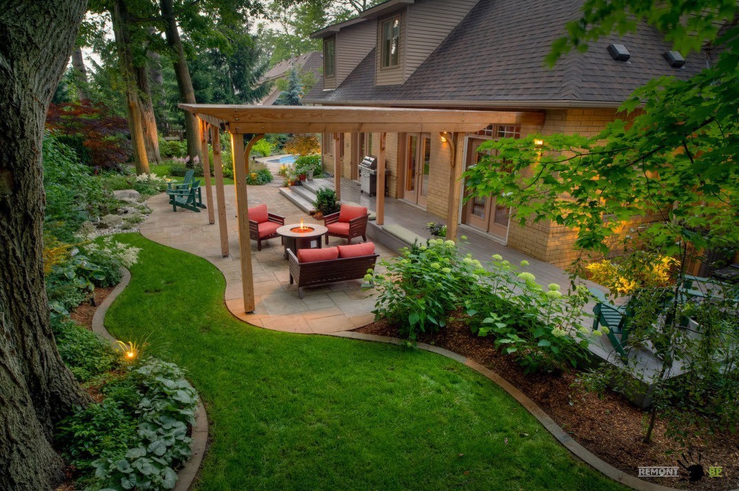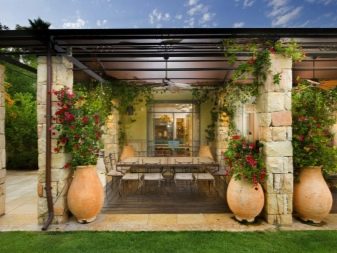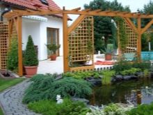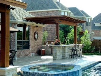 Often erected a small beautiful bathhouse with a barbecue area near the yard, a barn or greenhouse settles in the far part of a narrow area. It is not necessary to have a large gazebo next to the house. In order not to create a narrow shaded space between the two buildings. If there is a shortage of space, a barbecue area can be equipped near the house, while using the outdoor terrace of the holiday house.The nearby pool or pond will allow you to admire the watery surface while sitting in the cozy atmosphere of the veranda.