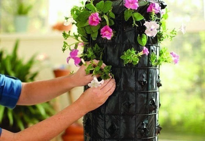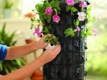 With a lack of space an alternative to the usual garden will be vertical. Decorative beds, made of halves of water pipes, colorful pots or wooden boxes, are suspended from the walls of buildings.