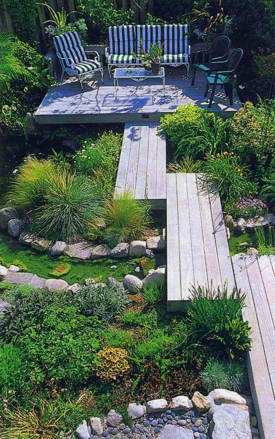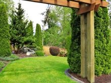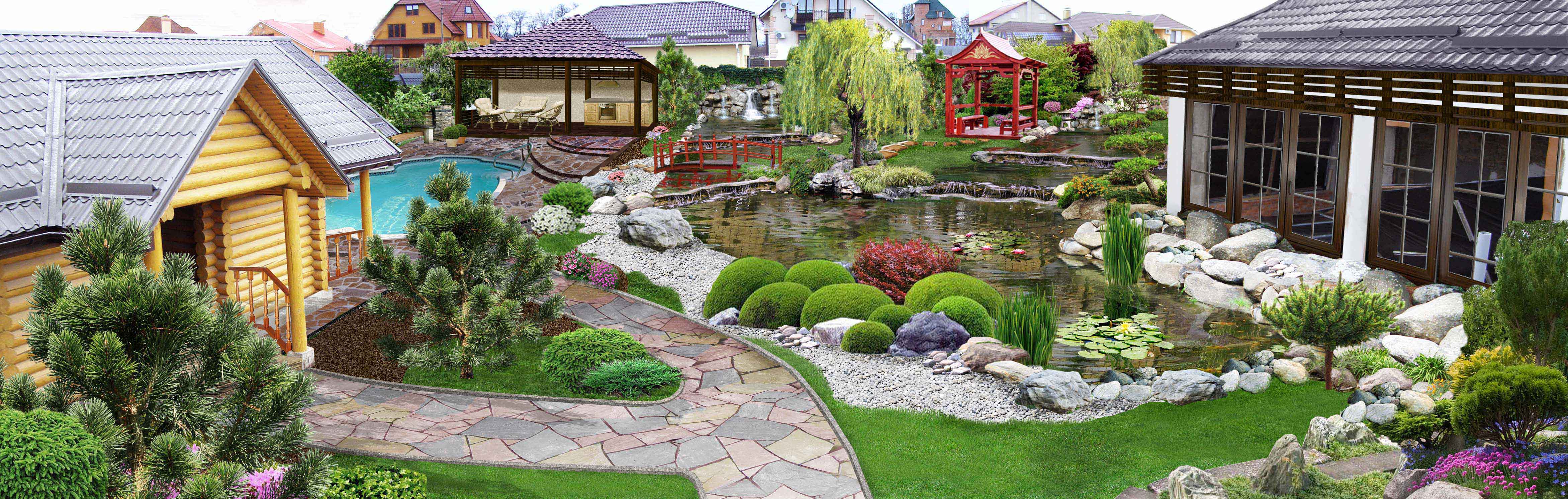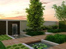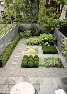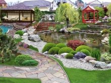 The pond is decorated with moisture-loving irises, ferns, astilbe. Japanese-style miniature pond planted with lilies. Rockery with beautiful cereal plants will attract attention with its natural beauty. Hedges protect from prying eyes and unwanted invasions, help to zone the territory.
