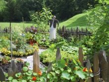 The beds of mixed plantings of vegetables and flowers, decorated with a beautiful border, should be shown to the guests, to follow the paths that will lead to a dry stream. Dry creek perfectly replace the real, if you can not organize the water supply. Small pebbles poured in an uneven stream from a pot or a vase stylized as a water source. The edges of the dry bed are lined with beautifully flowering low plants or moss.