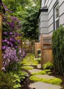 Plants will help to decorate nondescript rectangular fences. Along the fence you can arrange a hedge of trimmed thujas. The row of climbing roses looks beautiful in the form of an arched enfilade along the path.