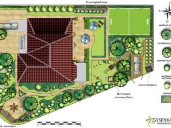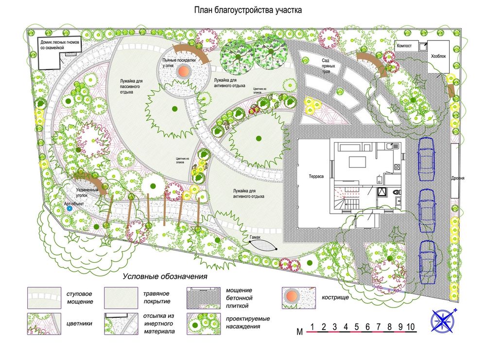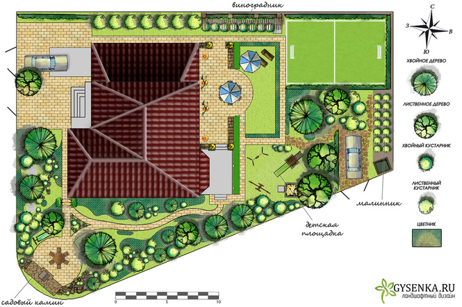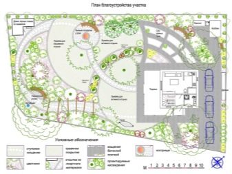 Landscaping the site is also applied to the plan. To do this, according to the reference book on crop production, determine the mode of lighting for a given species, the need for watering, the size of the crown of the selected plants in an adult state, and draw the circumference of the desired diameters in the appropriate places of the plan.See that the crowns do not overlap each other.