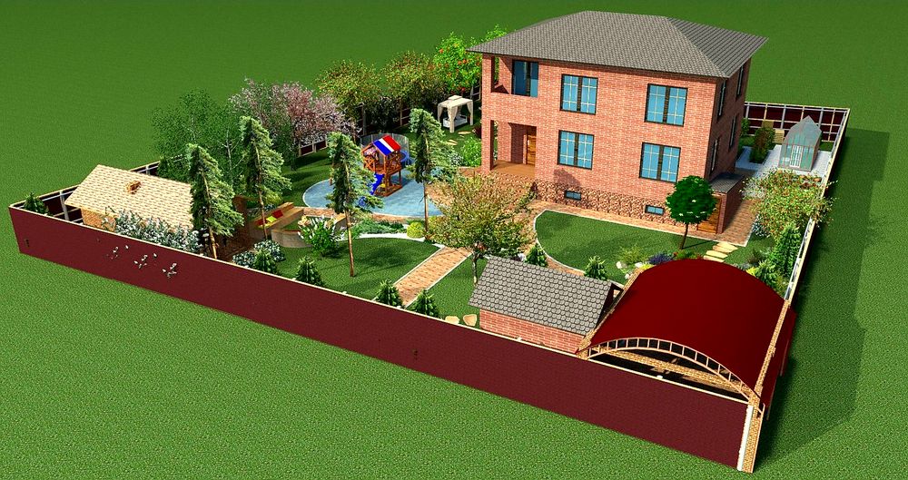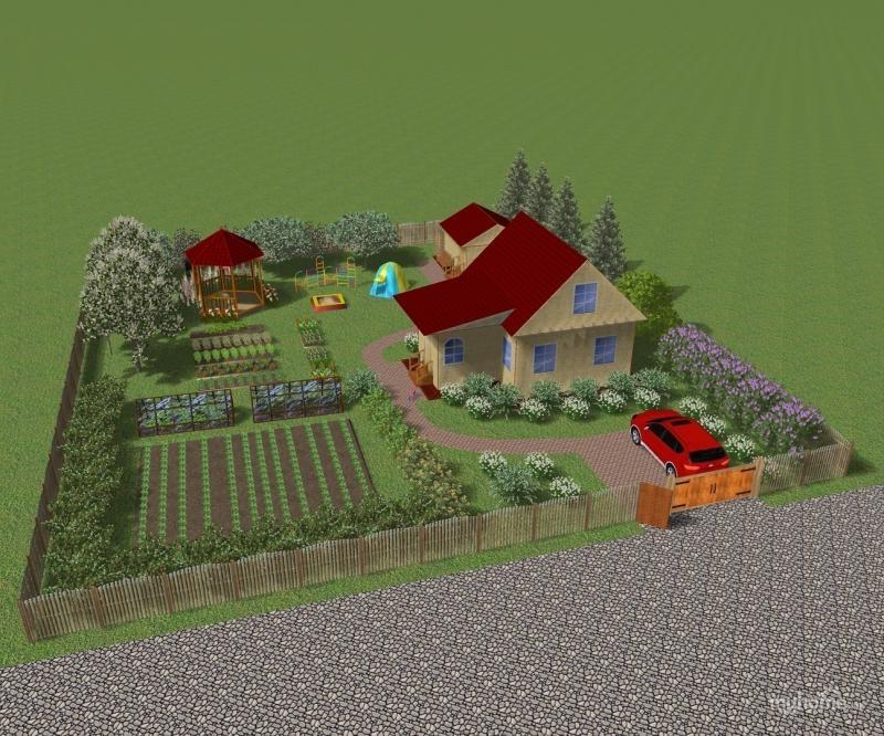 Belt planting fruit-bearing shrubs is convenient for processing and harvesting. The garden is allocated the sunniest place, parking for cars does not block the entrance to the house. There is also a place for a gazebo with a swimming pool, next to which you can have a barbecue.