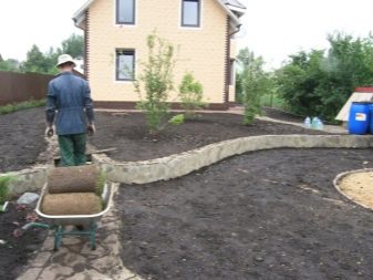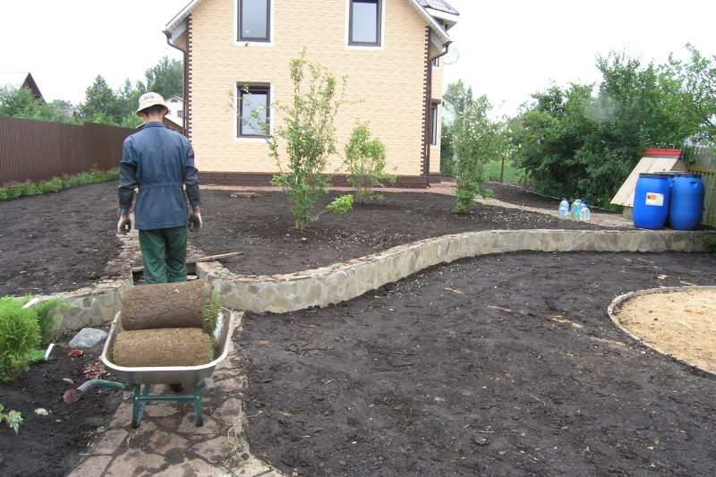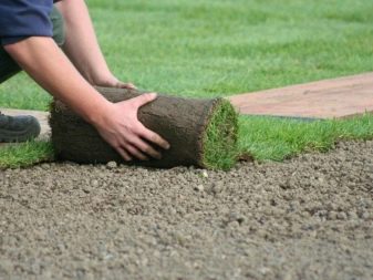The site designated for lawn drainage is required. To do this, remove the top layer of soil, put pebbles, fine gravel, pour sand, compact it, and place a cut layer of soil on top.