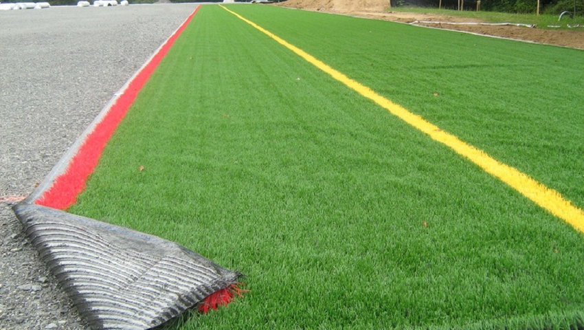 A special geofilm is placed under the artificial turf, which does not allow water to pass through. A geogrid is placed on top, which provides drainage.Next comes the textile fiber line.