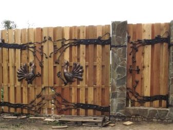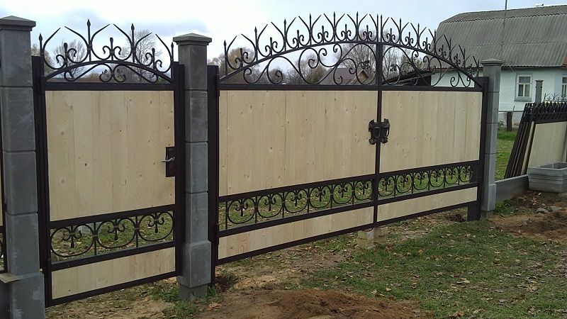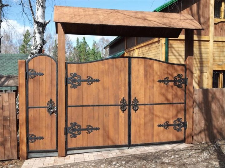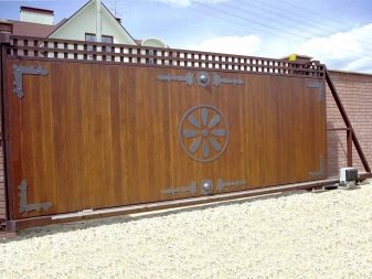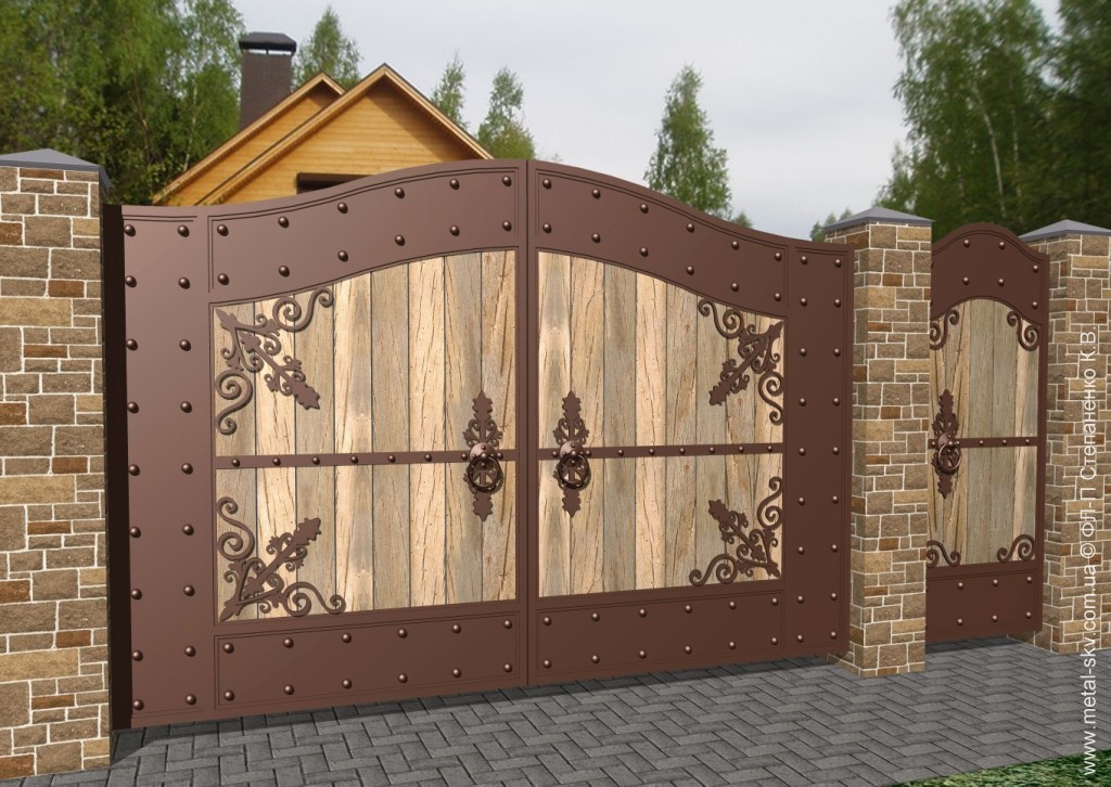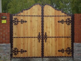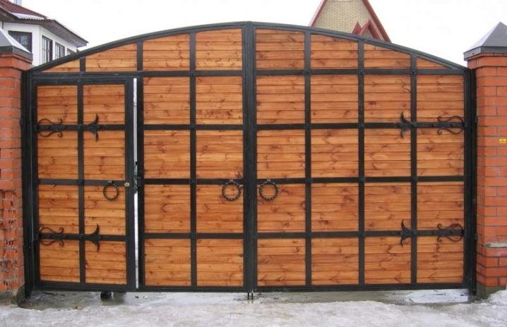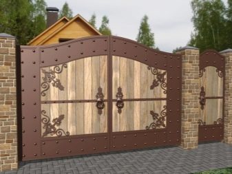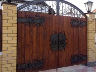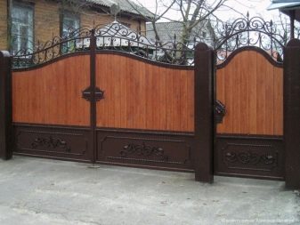 As an option, you can use iron gates with forging elements that mimic the look of natural wood. It would be even better to fill the sash with wooden details. To connect such dissimilar materials will help bolts, equipped with a semi-hollow head without edges. The frame needs to be drilled, then the boards are pulled to it by 2 or 4 fasteners. The nut is always left on the inside of the structure.