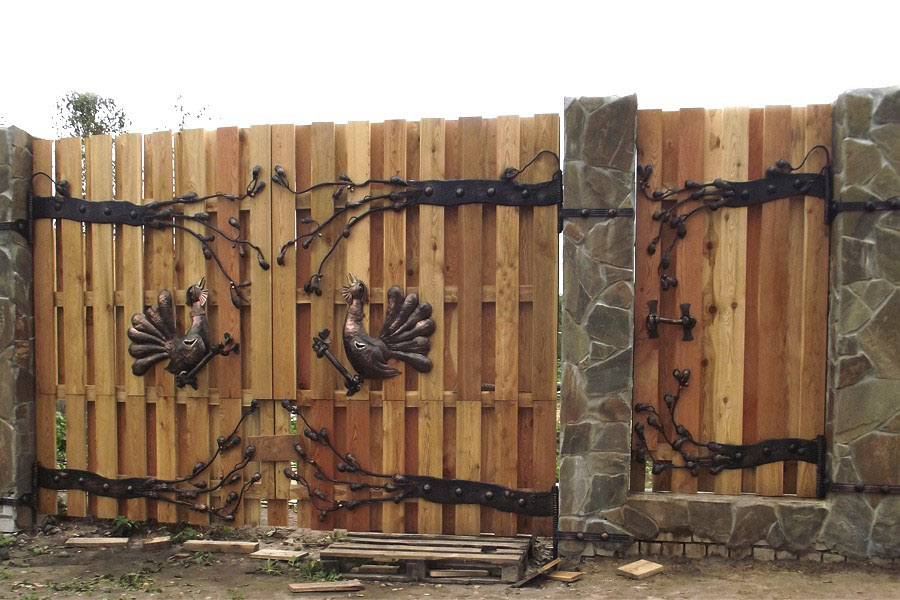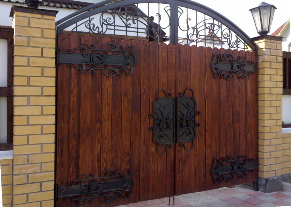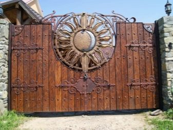 Even if your gate does not have wickets inside, the use of forged elements will help to make them more attractive. Against the background of dark brown wood, the use of horizontal "peak" superimposed on the base material looks very good. To get rid of excessive rigidity, such constructions are supplemented with twisted parts at the ends.But the main attention in this design project is attracted not by “peaks”, but by a stylized image of the sun in the middle of the upper part of the gate.