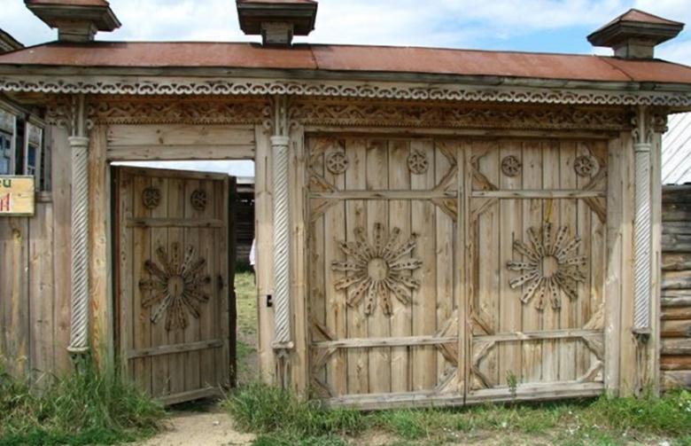 Elegantly and romantically, the gates look like “antiquity”, and this is exactly the case when pine details are unsuitable. The use of larch is a relatively economical solution to the problem, and the density makes it possible to prevent the effect of many negative factors.