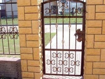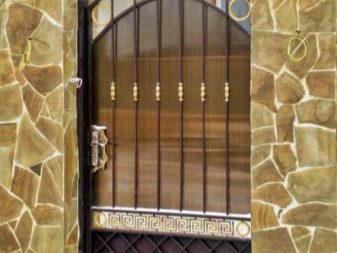 Forged wickets are often created with elements of corrugated and polycarbonate. Though it is artificial, but rather wear-resistant - and at the same time inexpensive materials. Sheet corrugated sheets come in different shades, which allows you to choose the gate to the color of the house or other parts of the fence. Such a structure will serve as long as the metal inserts, and under the gusts of the wind it will not bend (if properly reinforced such a frame).