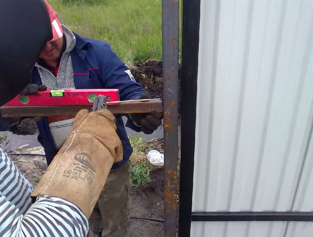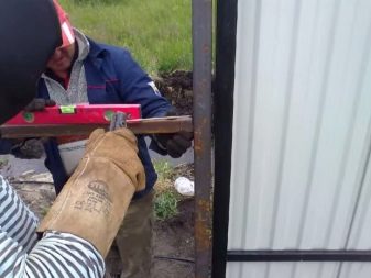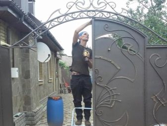 When the columns are installed, the hinges are attached with a welding machine., and after the installation, these elements should be lubricated with machine or special oil so that they do not creak. The joints, to which the hinges were welded, posts and other elements are better treated with a grinder to eliminate chips and irregularities. Then you need to remove residual dirt, apply a corrosion-resistant coating and paint the surface.