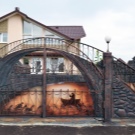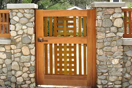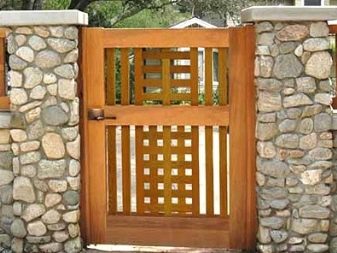 Constructions made of natural material will harmoniously fit into the fences near the forest.. A stone is allowed as a support. The gate looks aesthetically pleasing against the background of nature. Natural elements will last longer if they are treated with protective substances. The strength and stability of the structure is provided by stone pillars. If it becomes necessary to replace the main blade, the support will not require reconstruction.