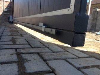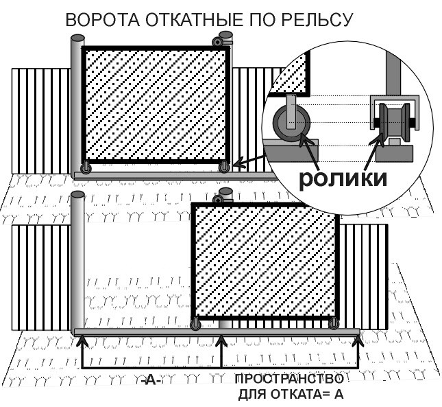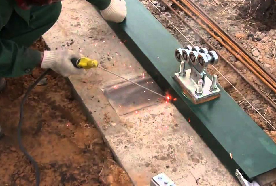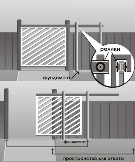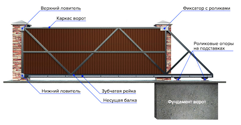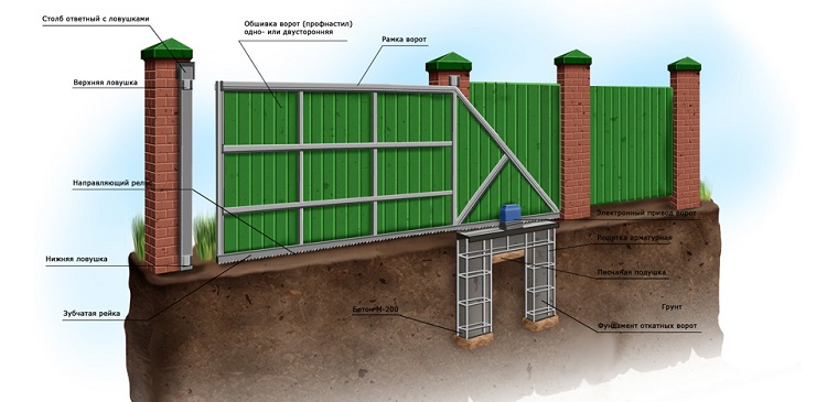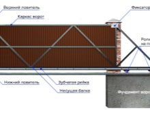 The pillars here are brick buildings on which the wheels are mounted. On the foundation there is a special profile that attaches from the side of the gate where the installation of the leaf is conceived.