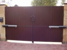 Simple device of swing gates. There are no guides and rollers. They can be opened either by opening or by opening. However, they require space, depending on the chosen opening direction. The frame is made of a profile of increased rigidity, sheathed with metal panels. It is possible to install automation or mechanical opening method.