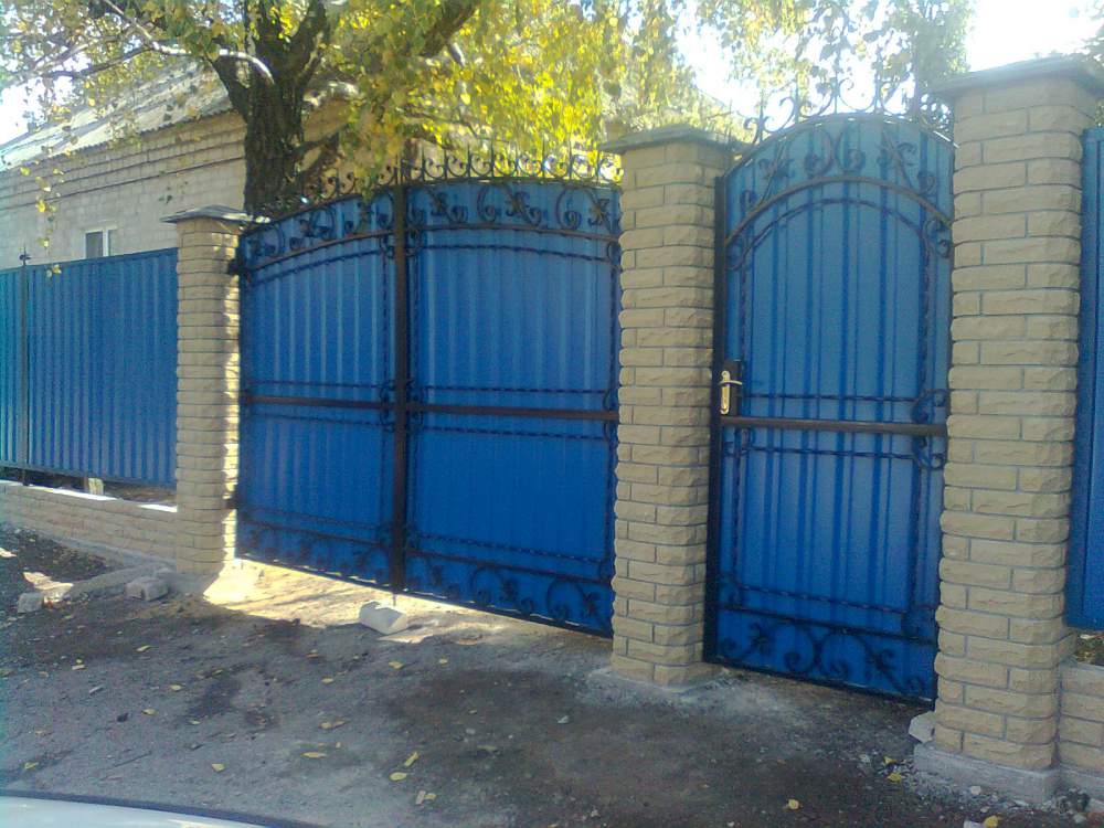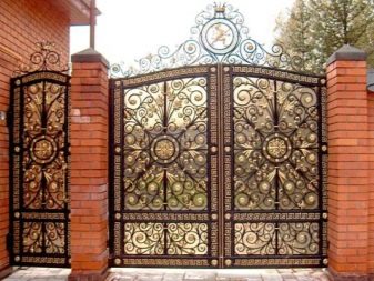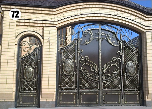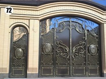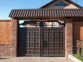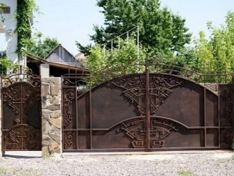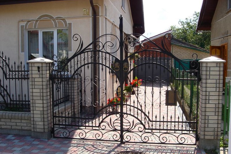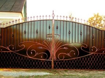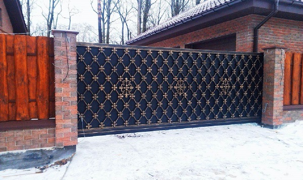 To give the fence a more stringent look, blind gates with fixed forged elements are suitable. It harmoniously combines metal and decorative ornament. The presentation and refinement of such a design speaks of the good taste of the owner of the suburban area. The system allows you to hide the territory from prying eyes.