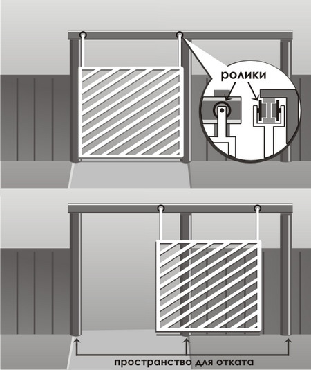 To prepare such a suspended structure, it is necessary to make two frames, one of which will be responsible for opening the gate, and the other will serve as fasteners for the whole mechanism.Often add welded elements to ensure the movement of the rollers mounted on the coating. But this is not their main function, since the installed fixture is capable of supporting the entire structure at the time of opening.