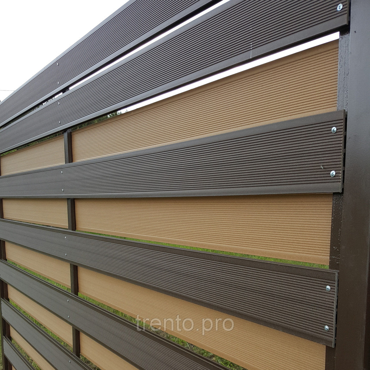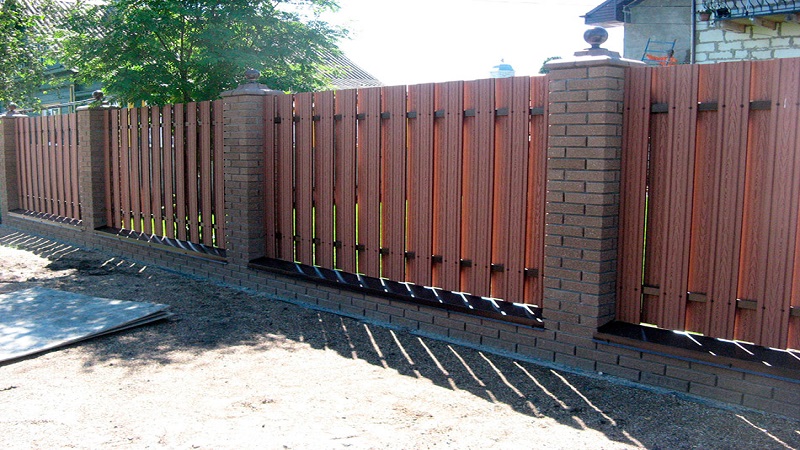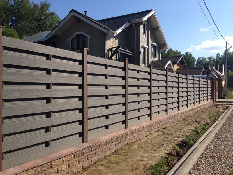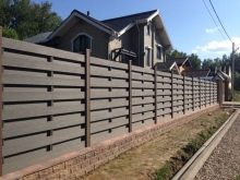 - WPC. Another material used is WPC. It is deciphered as a wood-polymer composite that has recently appeared on the construction market. Perfect for building fences. This board does not require additional care, it does not dry out, and is not afraid of any climatic conditions. Looks nice on the outside. Today most often used terrace polymer board. It is able to give the site a more well-groomed and extravagant look than a fence of ordinary boards. It is worth such a decking more expensive than usual, however, the cost pays for itself, because such a fence does not need to be painted. Such a fence will stand up to twenty-five to thirty years.