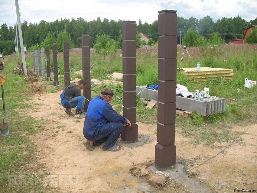 - The next step is to fill the foundation.because this is the most important stage in the installation of the fence. Therefore, it is necessary to do everything qualitatively, so that the fence has stood for many years. First of all, the wells for the pillars are dug out and filled with solution. They add small pieces of reinforcement or slate for strength. The pillars can be brick, iron or wood.