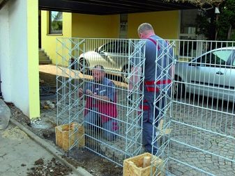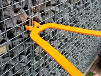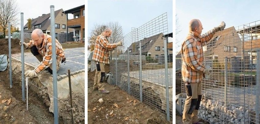 The frame must be attached to support posts using studs with bolts or welding. When you use a filler, it will hide the supports. To connect individual boxes to each other, use staples and wire. From time to time, check the leveling of the structure using a level. After installing the base of the mesh, you can attach a long rail outside: by doing so, you will ensure the evenness of the fence when laying the filler.