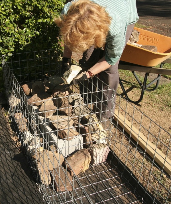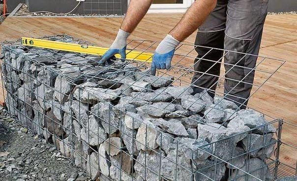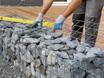 Then you can fill the free space. Laying filler in a very high gabion should be carried out in 3 stages. Stones will need to be laid one by one, with maximum accuracy. Rows should be made even using a board.