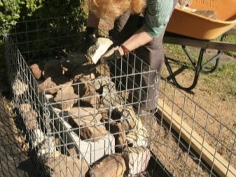Filling the base with stones or other filler is a process that can be called the most creative of all the above. Laying is carried out not in one stage, but in two. First put the filler to half the height of the fence.Then tighten the walls using thin steel cables, so you can avoid the protrusion of the mesh due to the weight of the filler. "Flash" will need all the fourth or fifth cells.