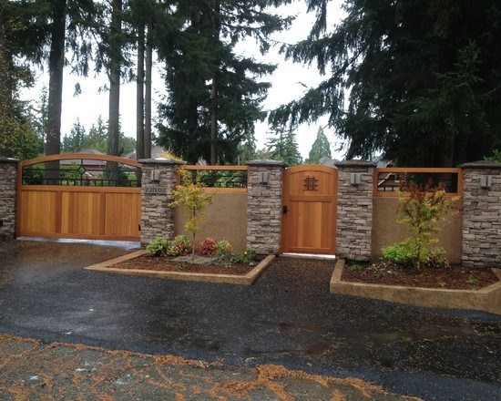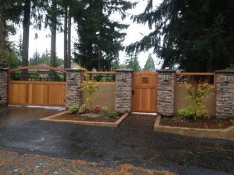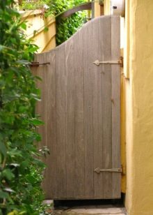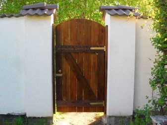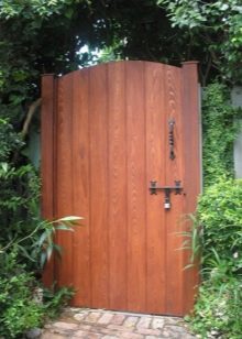 A wooden gate with a rounded top will look good in an ensemble with stone pillars of the base, a light brown fence, as well as entrance gates in a similar design.In order to give this construction a complete and more aesthetic look, it is necessary to break up small beds opposite the deaf fence sections and plant small trees there. On each pillar with stonework it is worth hanging wall lamps of compact dimensions.