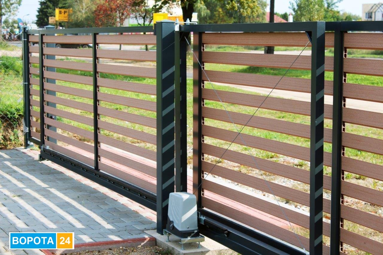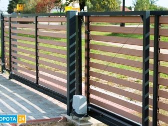 As in the case of hinged structures, sliding gates and gates can be supplemented with various finishing materials. Most often there are mechanisms trimmed with wood of different shades.