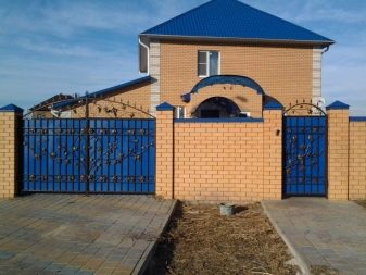 Against the background of a white brick fence, you can put a contrasting and bright gate, decorated with wooden panels. This design looks straightforward, but attractive. It can be arranged in front of a tall brick house or a small country house.In all cases, this design will look organic.