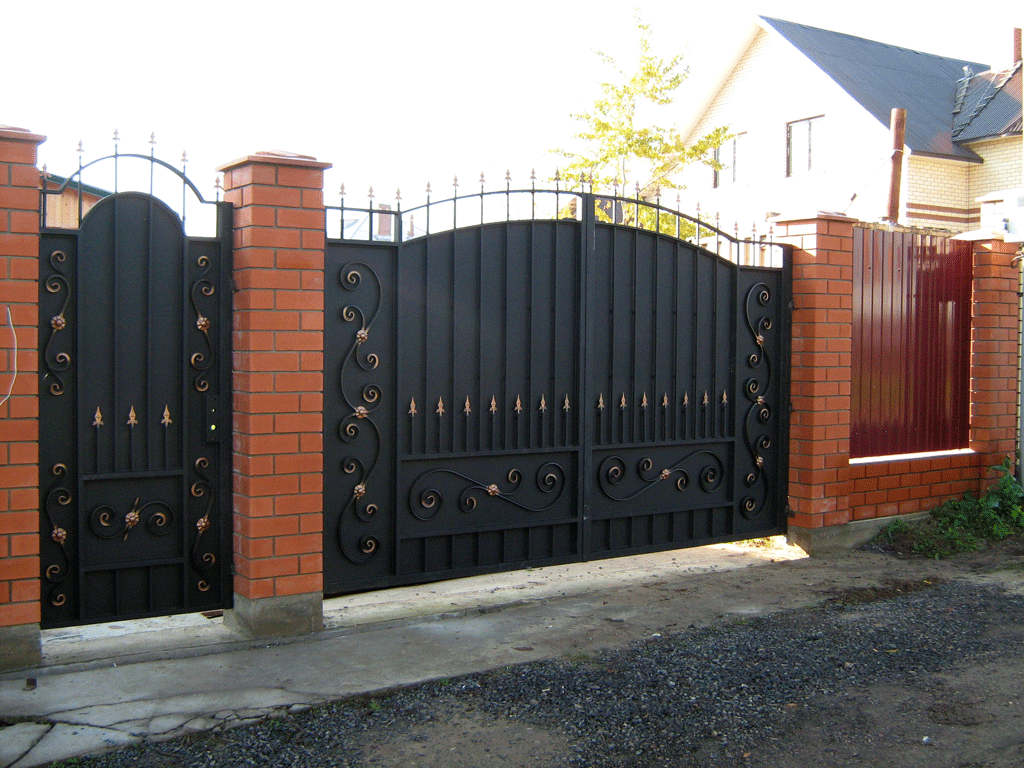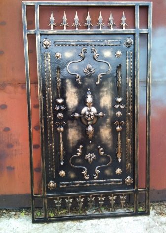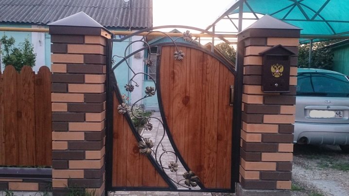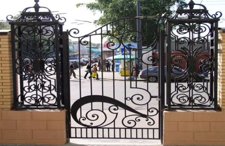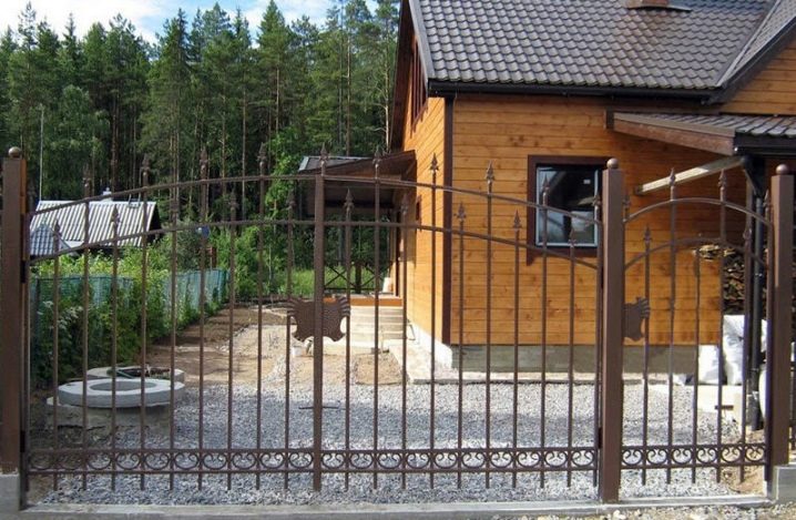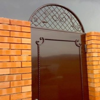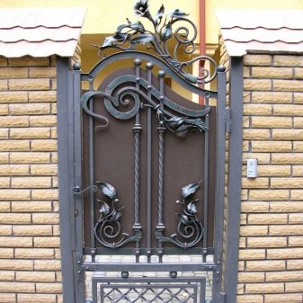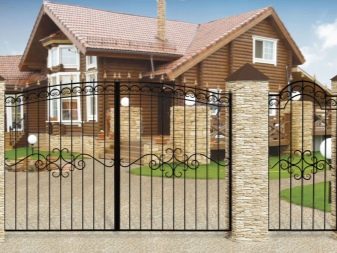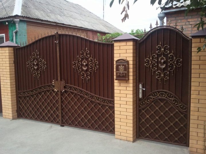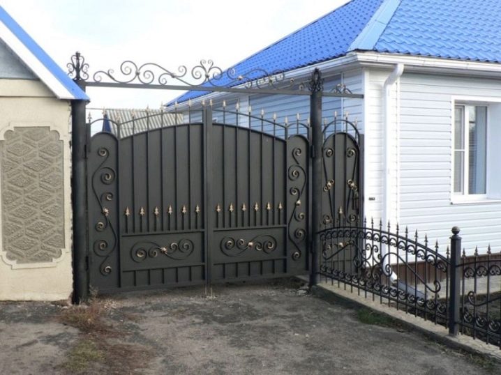 Metal gates are fairly simple and affordable. As a rule, they have straightforward designs.Often, ordinary metal is combined with forged elements that can be made independently (if you have the necessary materials and knowledge) or buy a ready-made version, and then weld it directly to the gate.