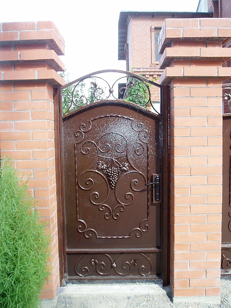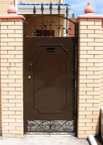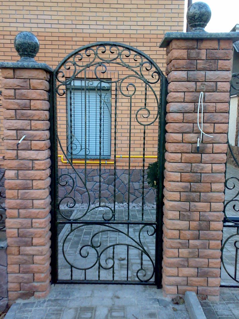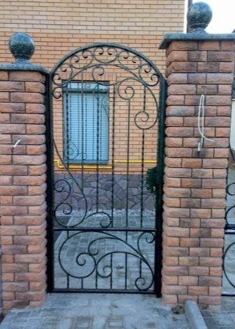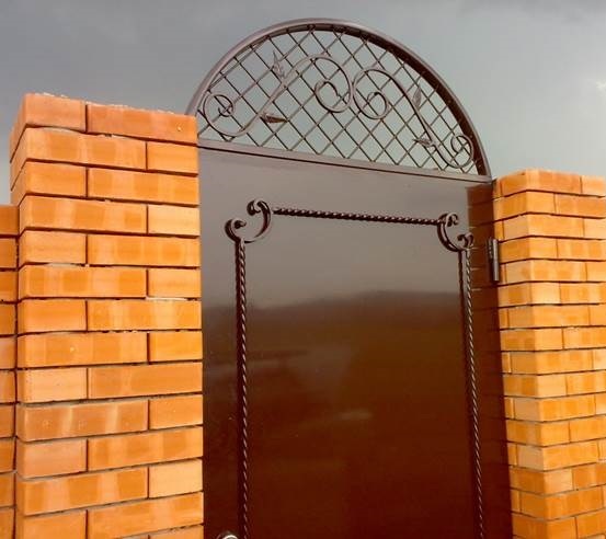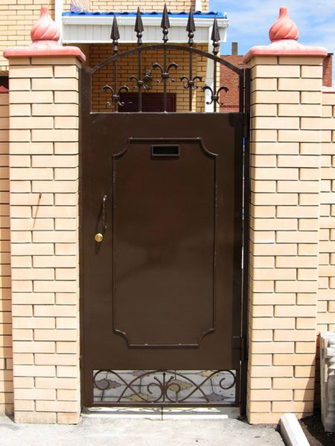 A low forged wicket with a through blade will look impressive against a cream brick fence. Next to it, you can install small decorative columns from a large forged structure with many patterned lines and beautiful weaves.