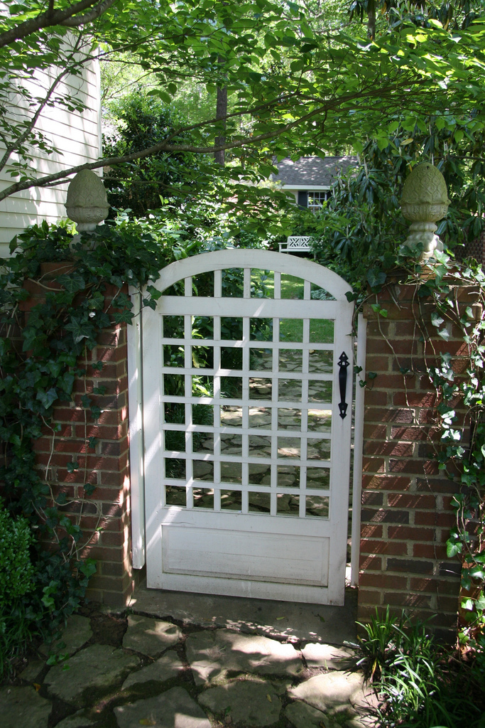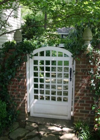 To enter the garden, you can install a small snow-white wicket made of wood with a lattice canvas and a forged handle. Such a model would look good in tandem with a low brick fence. Near the falling greenery and stone paths such a design will look romantic and mysterious.