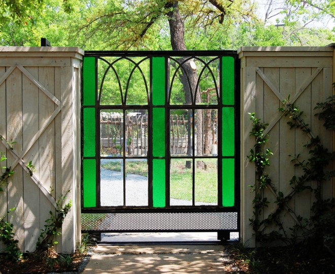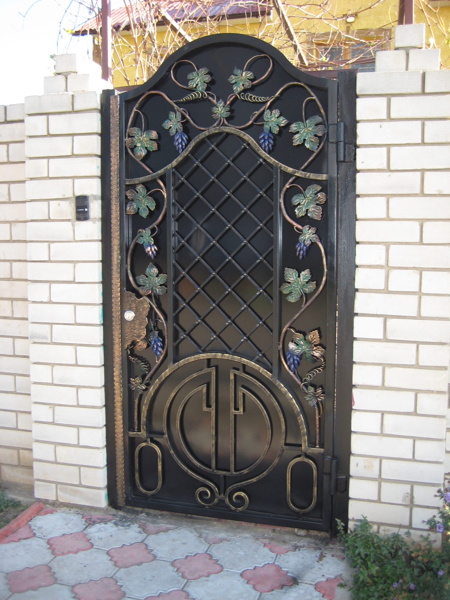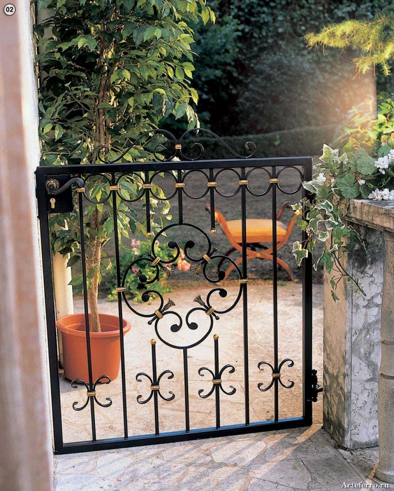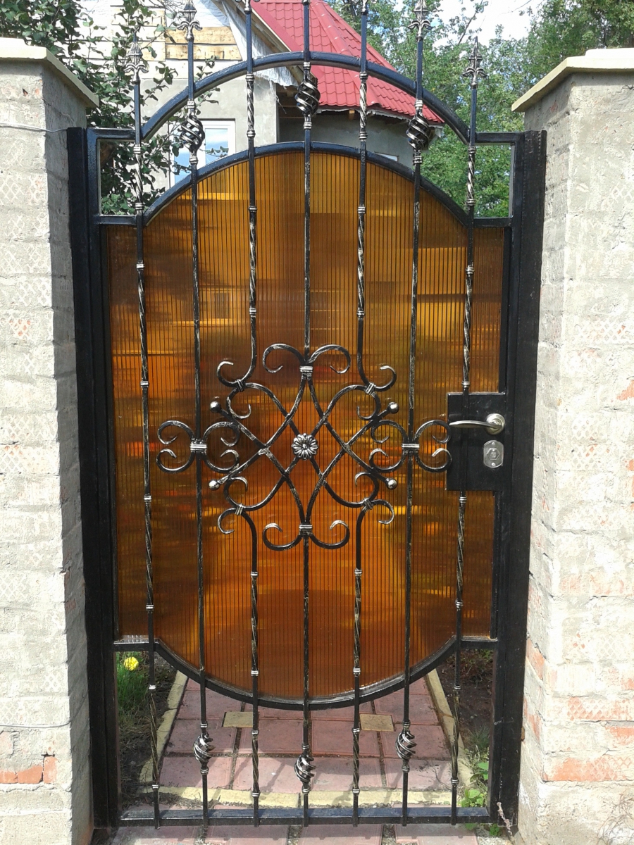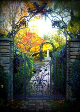 In the conditions of large and luxurious houses and plots the passage into the garden should not be made modestly. In such conditions, a high through wicket of unusual shape with spectacular weaves of patterned lines will look more harmonious. This model will be organically combined with an expensive stone fence, stylized antique.