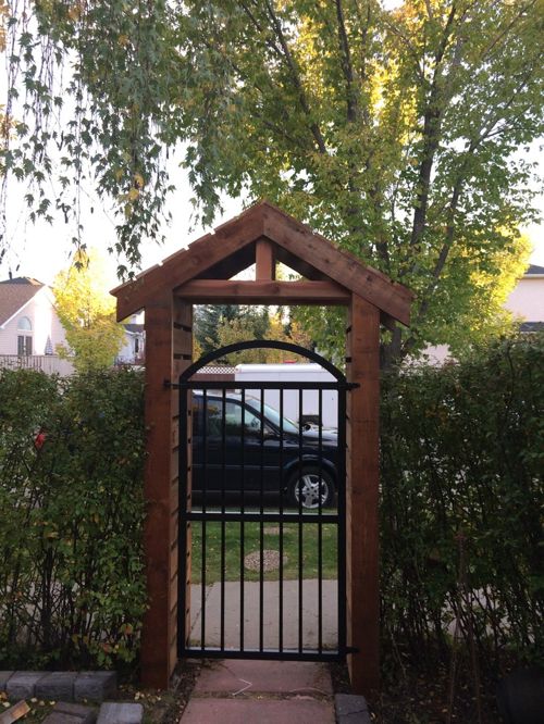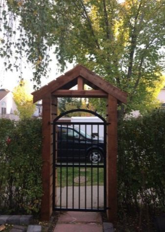 On the site will look great simple lattice gate of metal, framed in a wooden structure with a small triangular roof. On both sides of this product, a hedge can be planted.
