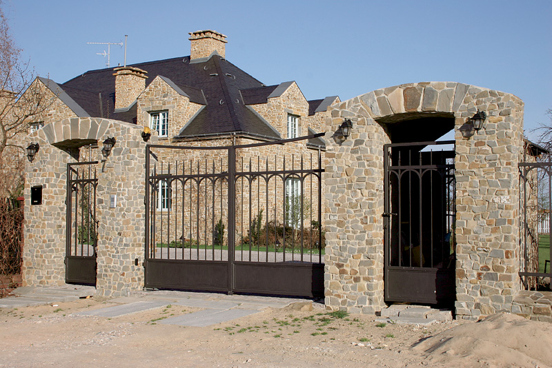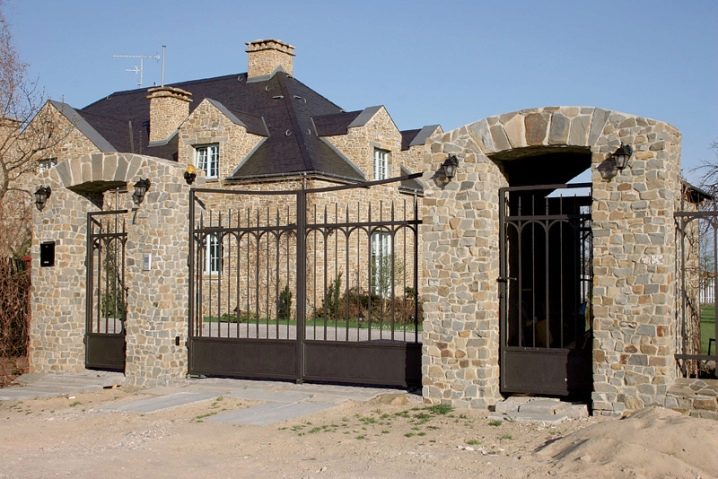 If you are a fan of unusual and non-standard solutions, then you should take a closer look at the minimalistic metal gates present in the stone arches. There can be two such shutters in front of the house, and between them, high black metal gates will find their place. As a rule, such constructions are used to design the area opposite expensive houses, decorated with stonework.