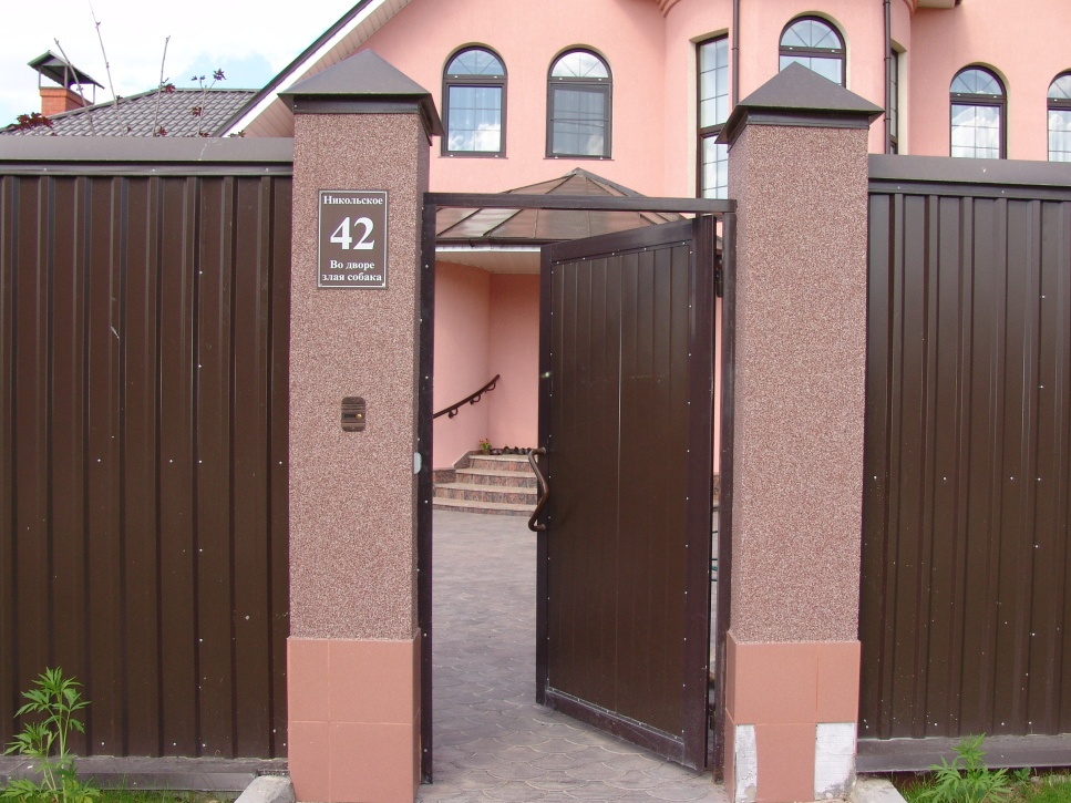 The gate from a metalprofile is a universal decision which will look harmoniously in a tandem with different facades of buildings. Thus, an attractive system with a swing gate and a chocolate-colored fence will be a great addition to the house in peach tones. The same color should be arranged and the columns of the base of the gate.