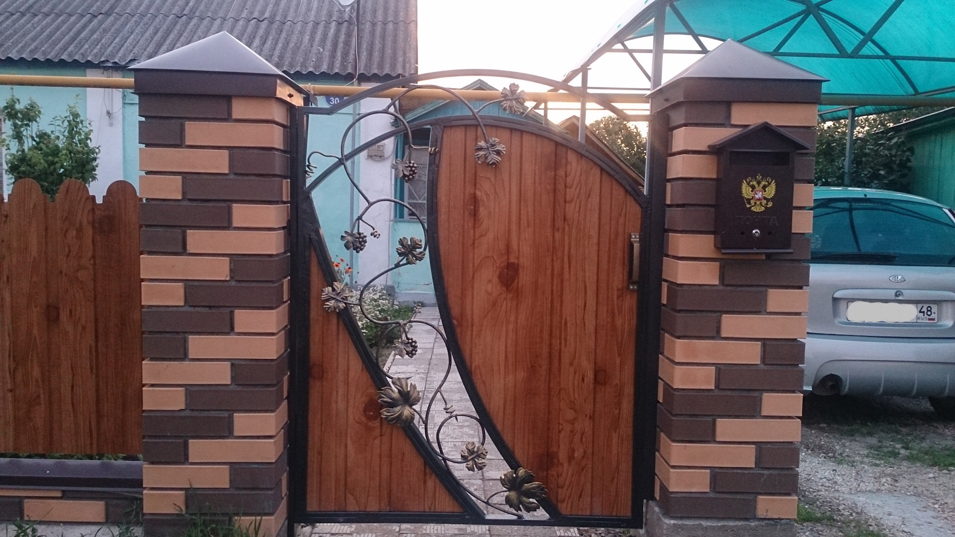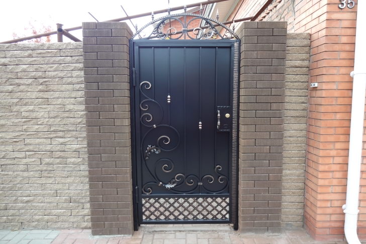 A combined wicket, which combines a black deaf canvas and an openwork forged insert over it, will look harmoniously in tandem with the same gate next to it. The line between the gate and the gate can be divided by a low forged fence of black color.