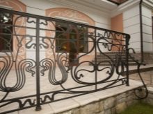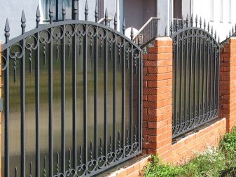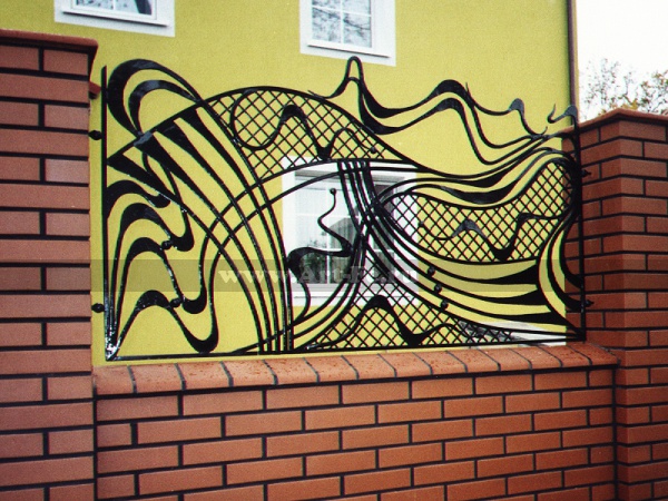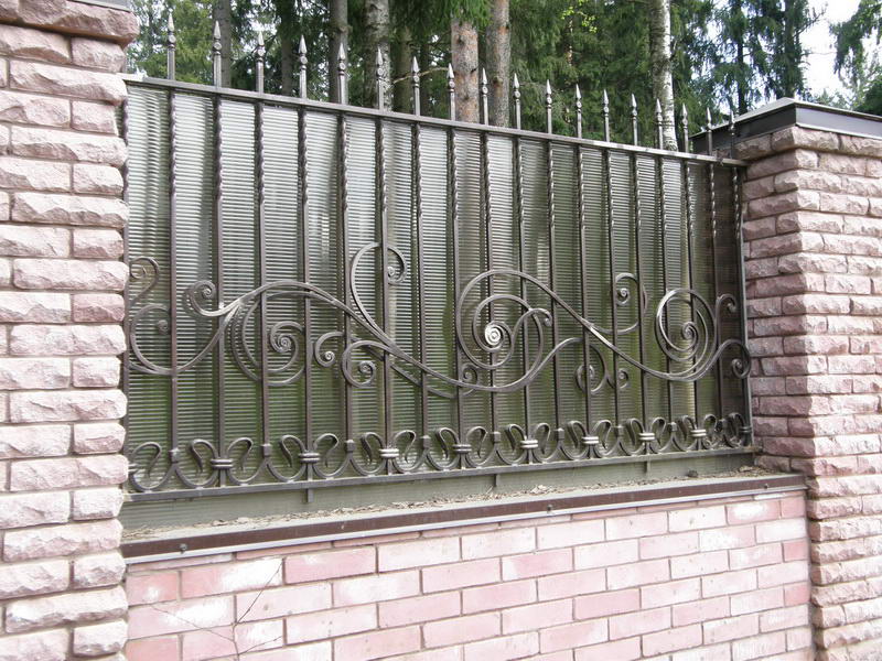 Protective types of fencing can be attributed to the most inexpensive. It can be said that this is not hand-made forging, but its imitation, which is made by stamping. They sell such products most often in sections, which are installed between brick or metal supports.In the manufacture of these types of fences are often used polycarbonate. On the panels of polycarbonate graceful forged jewelry looks very interesting. In addition, such protective fences reliably protect the building from the views of uninvited guests.