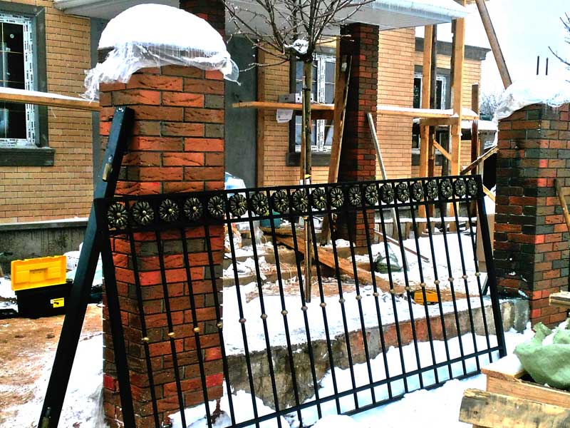 Sections are attached to the posts with the help of special fastening structures or by welding. Embedded parts are installed in brick or stone pillars, sections are attached to them. Forged gates are attached to the brick pillars. After the installation work, special caps are placed on the poles.