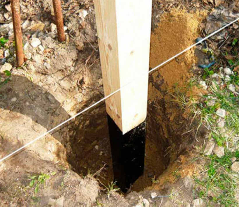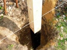 As already mentioned, wooden poles are used for the most part for light intake structures, therefore, their mounting is a fairly simple matter. Drilling of a pit under a wooden support is carried out to a depth of about 0.5 m, if the height of the support part rising above the ground does not exceed 1.5 m. With a greater height of the enclosure, the depth of the underground part increases according to the principle that the lower part deepened into the ground should be 1 / 3 of the total length of the pole support.