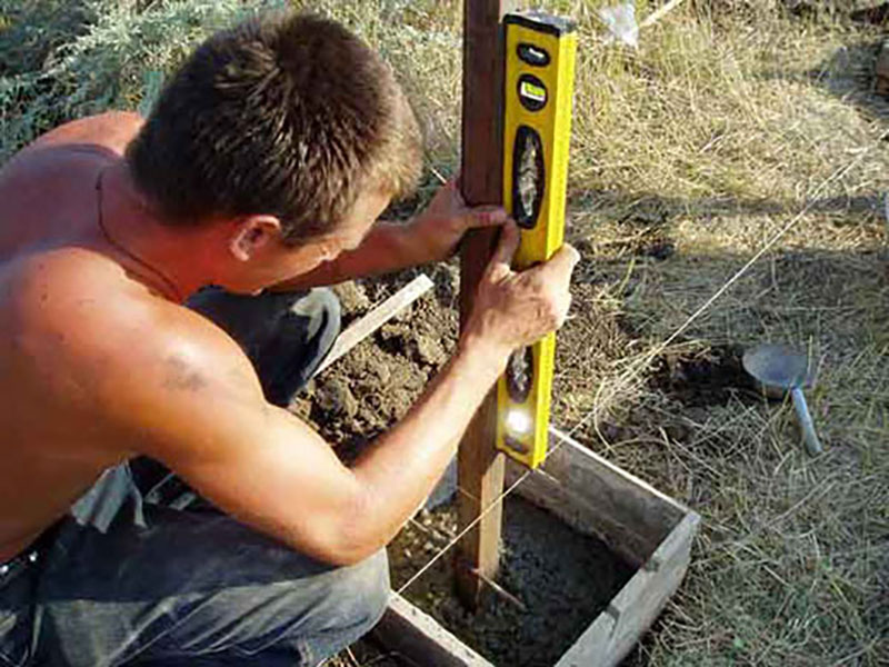 Then you should install four support pillars at the corners of the site, fixing them in the ground in one of the ways, which will be discussed in the next section.These columns, as well as all the others, should be leveled in height and set exactly in the vertical plane with the help of the building level. Between these pillars, the cord should be re-tensioned and the intermediate pillars should be aligned on it, which will be installed in the holes prepared in advance with the above dimensions.