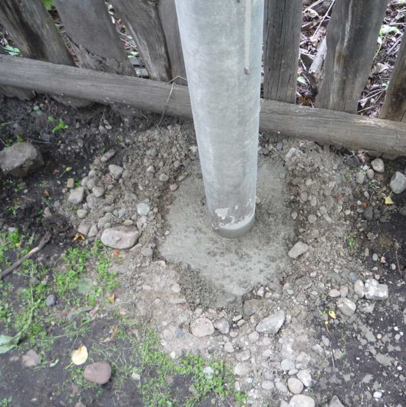 After waiting for the solution around the rod to harden, an asbestos-cement column is put on it and the entire remaining volume is poured with concrete to the very edge of the formwork. To protect the pipe from bursting in winter due to freezing water, the internal cavity of the pole supports is filled with concrete to the very top, forming a convex cap from it to prevent accumulation of water in the support.