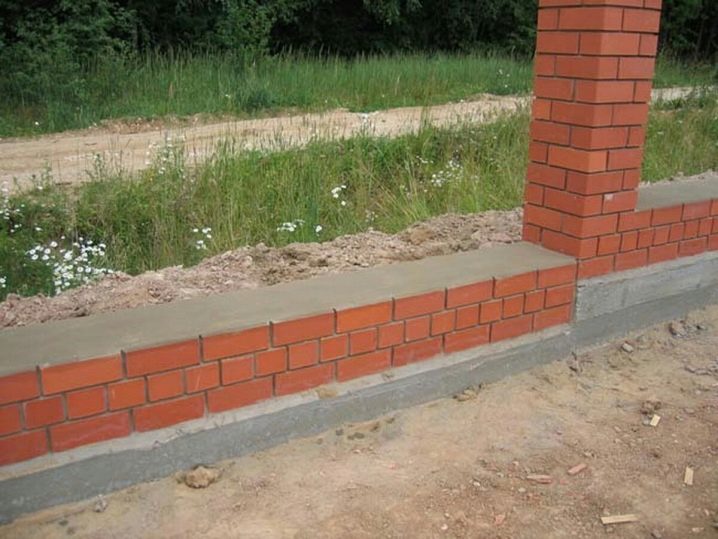 The surface of the foundation is covered with a layer of waterproofing. Before you start laying, make sure that the markings are correct. By folding the first row, the accuracy of the masonry is checked at the building level. Frame made of reinforcement or pipes are lined with bricks, filling the cavity with concrete mixture.