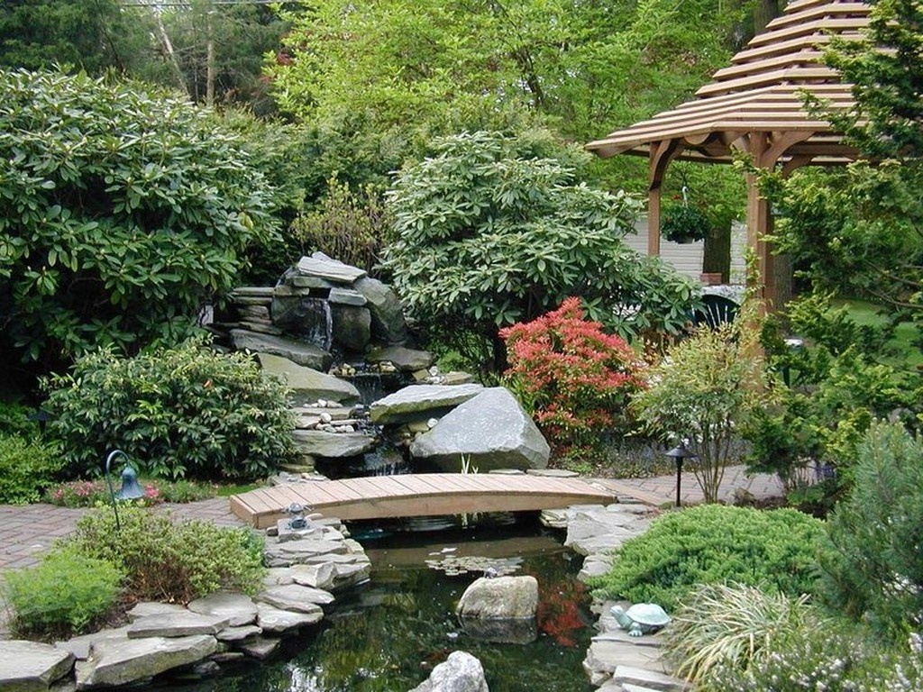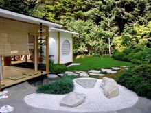 The main difference between the village and other styles is the presence of a stream or reservoir with a bridge. Original and interesting will look the area, decorated with a garden of stones and small bushes. Juniper, dwarf trees, jasmine, rhododendron, fern will help to move to the bliss of harmony and tranquility - they are perfectly combined with water and stones.