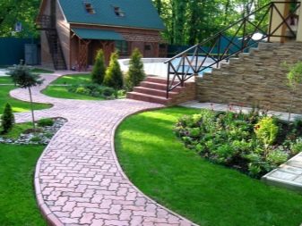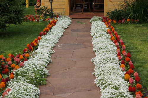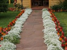 You can also decorate the path on the sides with a bright floral carpet. The width of the flower stripes can vary from a few centimeters to half a meter. It all depends on the size of the site and the overall composition. The width of the path should be comfortable for the passage of two people, the optimal size is 1-1.5 m, and the surface itself should be smooth, without any inclinations in the middle, otherwise water will accumulate on the path.