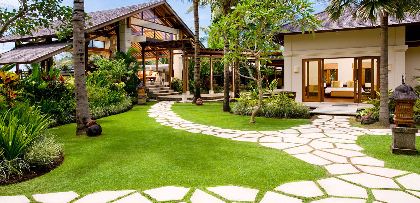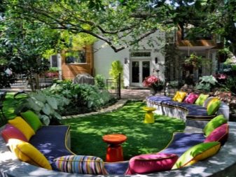 This is an amazing direction with bright colors, unusual shapes and sculptures on the site. In this case, the lines of the facade of the house should be repeated in the area: paths, street flower beds, garden sculptures and furniture. For example, a bench can repeat plant lines or tree branches.