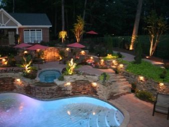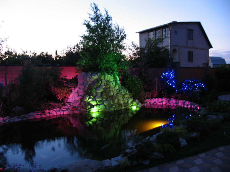 Street lighting will give a fabulous and magical atmosphere, and also make the site more interesting in the evenings than during the day. It is better to use cold light for tracks, turns and entrances in the territory, and warm light in the rest area. Illumination of a reservoir or pool will create beautiful iridescent highlights. You can also additionally illuminate trees, bushes and flower beds.