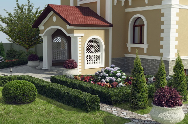 Beautifully decorated front door in the house will give confidence and solidity to the suburban area. Even if the house is located along the road, you can arrange the entrance through a closed veranda or patio.