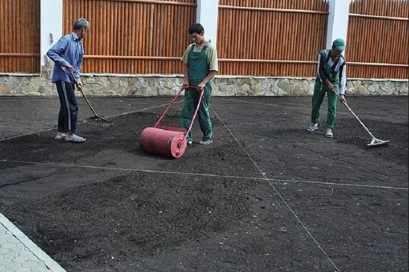 - After ramming, you can start planting a lawn and sow the seeds. Top need to sprinkle dry earth - this will protect the seeds from birds.