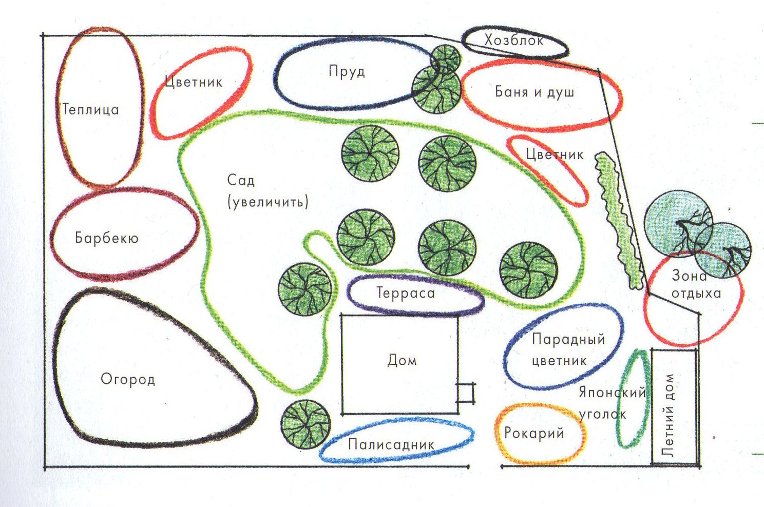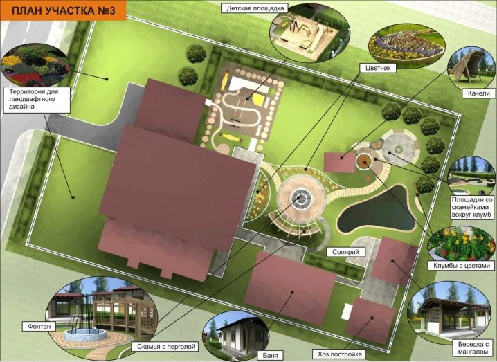 First of all, the plot is divided into main zones: residential, garden, vegetable garden, recreation area. Depending on preferences and desires, you can add such details as a garage, summer kitchen, bath, shower and a place for walking animals. In the residential area there is a house, a sauna, a closed courtyard, a terrace and a garage.