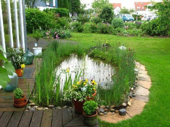 - If there is a ravine or a pit in the plot in which water accumulates, turn this disadvantage into an advantage. Create a small pond with bubbling water. Around the pond, you can make a stony path and plant perennial flowers: lilies and forget-me-nots.