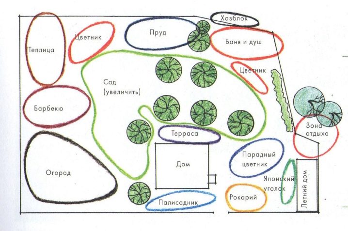 If you plan to grow fresh vegetables and greens in the garden, then it is better to single out the southern part of the garden for a vegetable garden, and to plant trees on the northern side or to arrange farm buildings. The central area is to provide a recreation area and decorate it with bushes and flowerpots with flowers.Make sure that the flowerbeds remain blooming throughout the summer season.